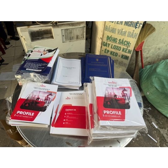 In hồ sơ năng lực, bìa trình ký đẹp – giấy C300 cán màng mờ 2 mặt. In màu chất lượng cao, ép keo, đóng gáy chuyên nghiệp tại Photocopy Minh Ngọc.